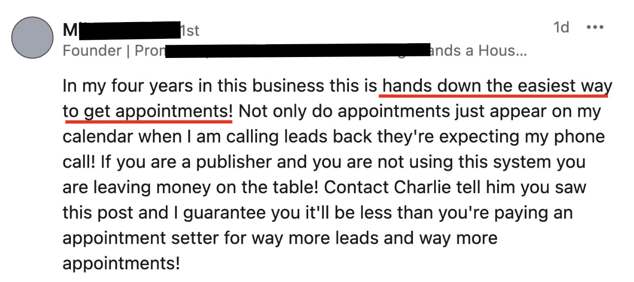 I thought, "What if I could eliminate the unreliable appointment setters? That would free up $1,500/mo. and save me the time I spent in hiring and managing them."